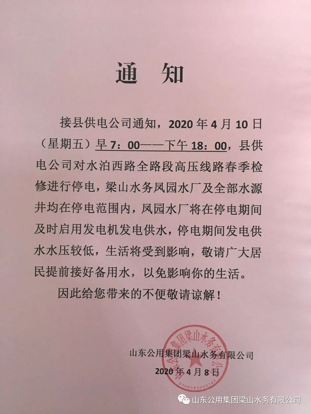 接县供电公司通知,2020年4月10日(星期五)早7:00——下午18:00,县供电公司对水泊西路全路段高压线路春季检修进行停电,梁山水务凤园水厂及全部水源井均在停电范围内,凤园水厂将在停电期间及时启用发电机发电供水,停电期间发电供水水压较低,生活将受到影响,敬请广大居民提前接好备用水,以免影响您的生活。
